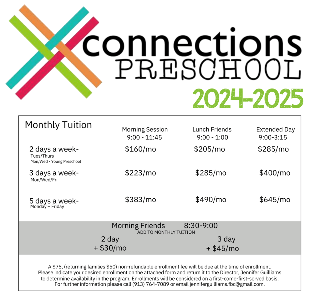 Please click “ENROLL” below and indicate your desired options on the attached form. E-mail the completed form to Jennifer Guilliams, Preschool Director, at jenniferguilliams.fbc@gmail.com. Enrollments will be considered on a first-come, first-served basis. A $75 (returning families $50) enrollment fee will be due at the time of enrollment.
